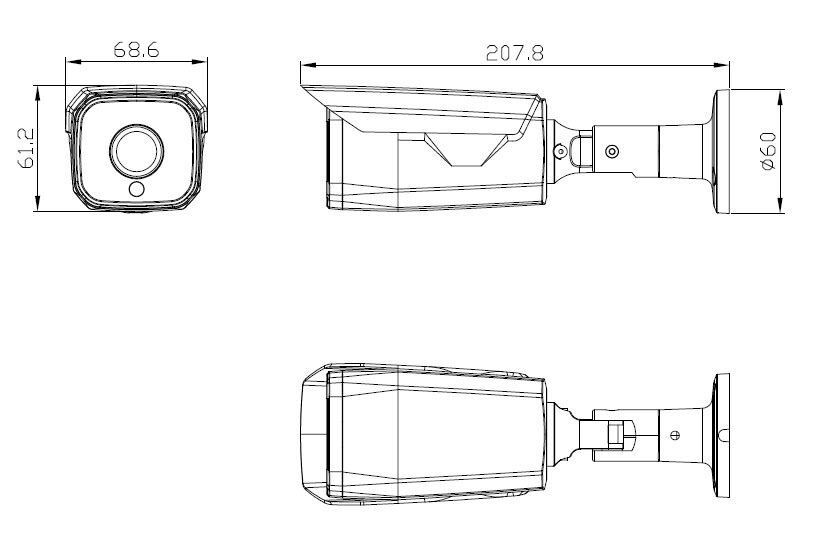 PINETRON Full HD 4v1 CCTV kompaktní kamera s MP 3.6mm objektivem, 2ks Array IR LED 850nm s dosahem až 35m, 1/2.9" SONY 2.1MP CMOS Sensor, rozlišení 1920x1080@25/30fps, citlivost 0.01Lux při F1.2, Sens-UP 1-8x, D-WDR, AGC/BLC/HLC, 2D/3D DNR, odstup S/N max. 58dB, PAL/NTSC, OSD s ovládáním po kabelu UTC, Defog, Motion, Privacy Mask, Mirror, ACE, Digital Zoom, BNC video výstup přepínatelný AHD1080p/HDCVI/HDTVI & CVBS 960H, napájení 12VDC, odběr 12VDC/300mA, rozměry 207 x 67 x 62mm, krytí IP66, provozní teplota -20℃ až +60℃, 10%-90%RH, váha 0.9kg.