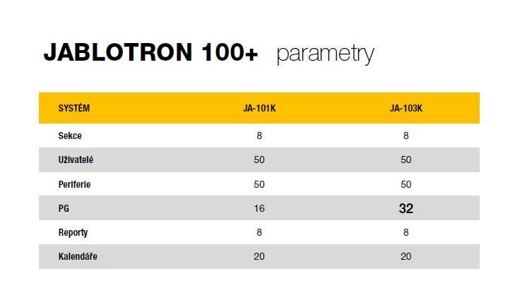Ústředna JA103+ s LAN, GSM/GPRS komunikátorem JA-192Y a rádiovým modulem JA-111R. Základní prvek systému JABLOTRON 100+ je určen k ochraně rodinných domů, kanceláří a menších firem. Požadované nastavení a velikost systému se programuje prostřednictvím softwaru F-link (od verze 2.0.0).